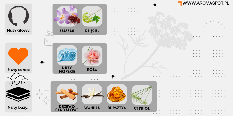 Nutami głowy są Dzięgiel i Szafran; nutami serca są Nuty morskie i Róża; nutami bazy są Drzewo sandałowe, Wanilia, Bursztyn i Cypriol.