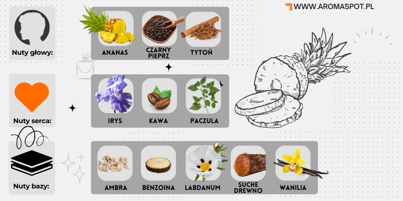 Nutami głowy są: Czarny pieprz, Tytoń i Ananas; nutami serca są: Paczula, Kawa i Irys; nutami bazy są: Wanilia, Ambra, Suche drewno, Benzoes i Labdanum.