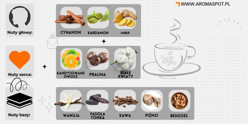 Główne akordy: ciepły korzenny słodki waniliowy kawowy cynamonowy ambrowy