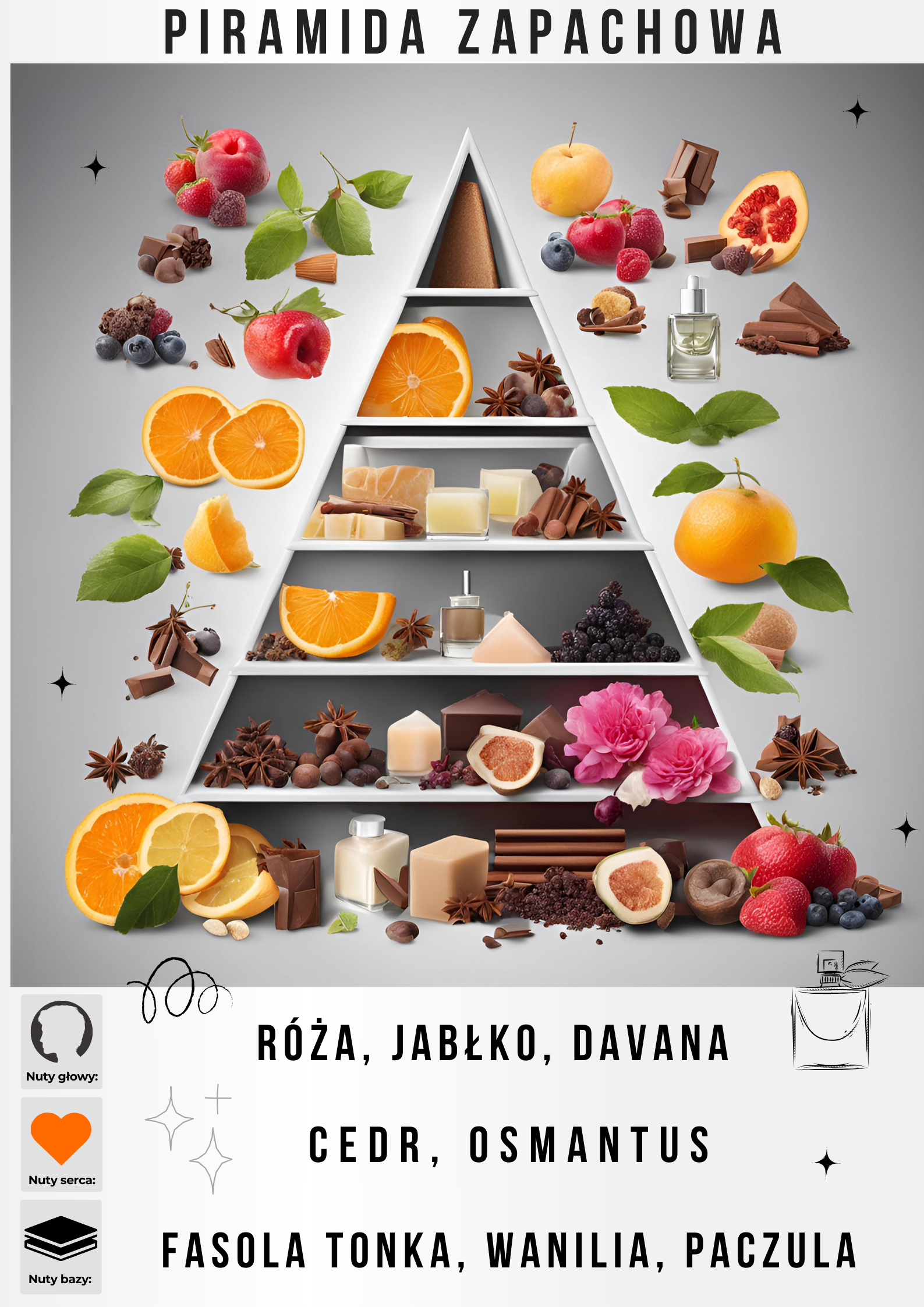 Nutami głowy są: Róża, Jabłko i Davana; nutami serca są: Cedr i Osmantus; nutami bazy są: Fasolka tonka, Wanilia i Paczula.