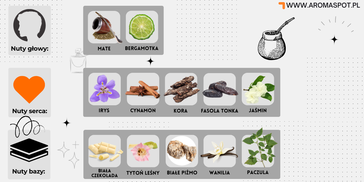 Nutami głowy są: Mate i Bergamotka; nutami serca są: Irys, Cynamon, Kora, Fasolka tonka i Jaśmin; nutami bazy są: Biała czekolada, Tytoń leśny, Białe piżmo, Wanilia i Paczula