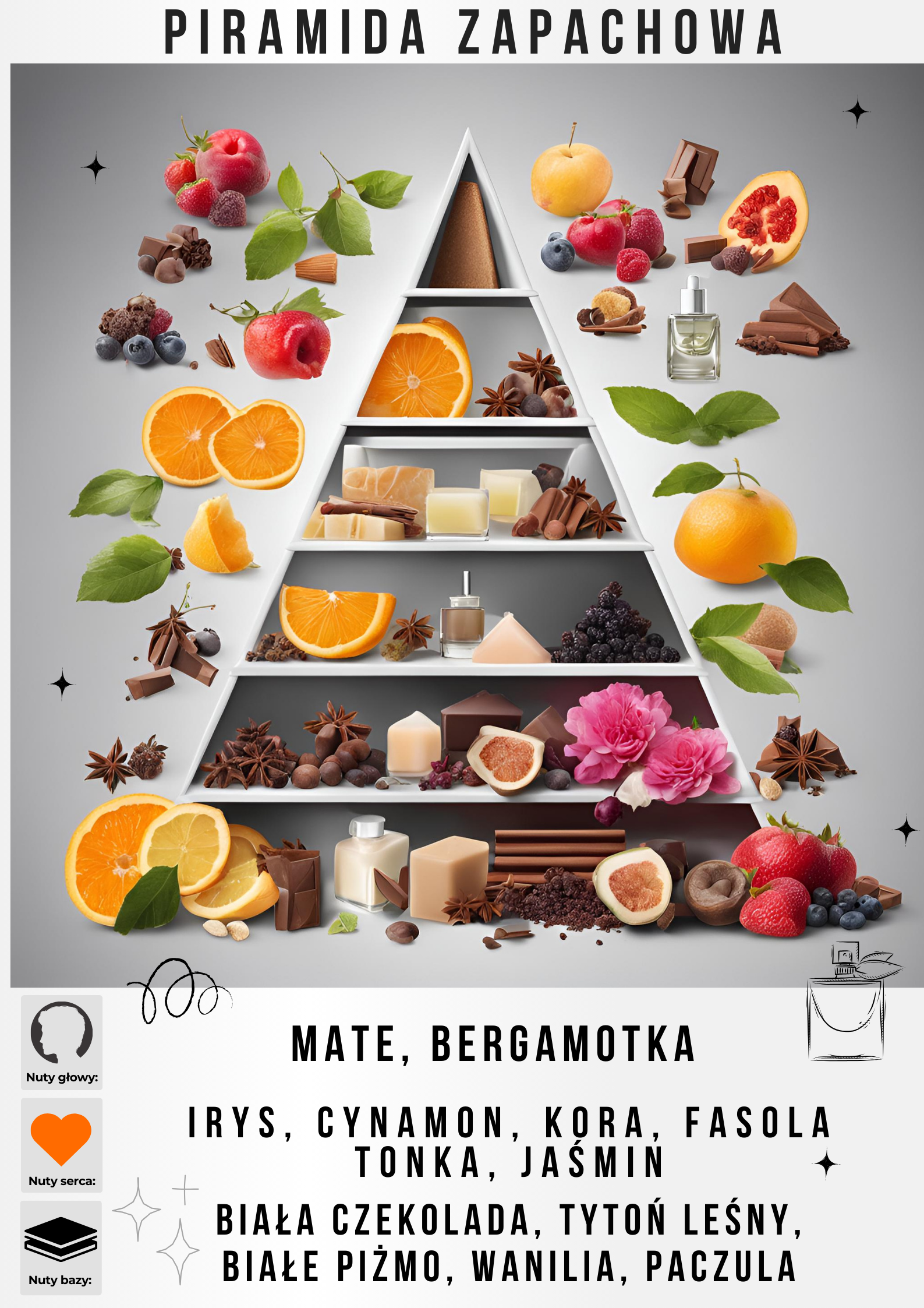 Główne akordy: białe kwiaty pudrowy słodki waniliowy drzewny irysowy ciepły korzenny piżmowy aromatyczny cynamonowy