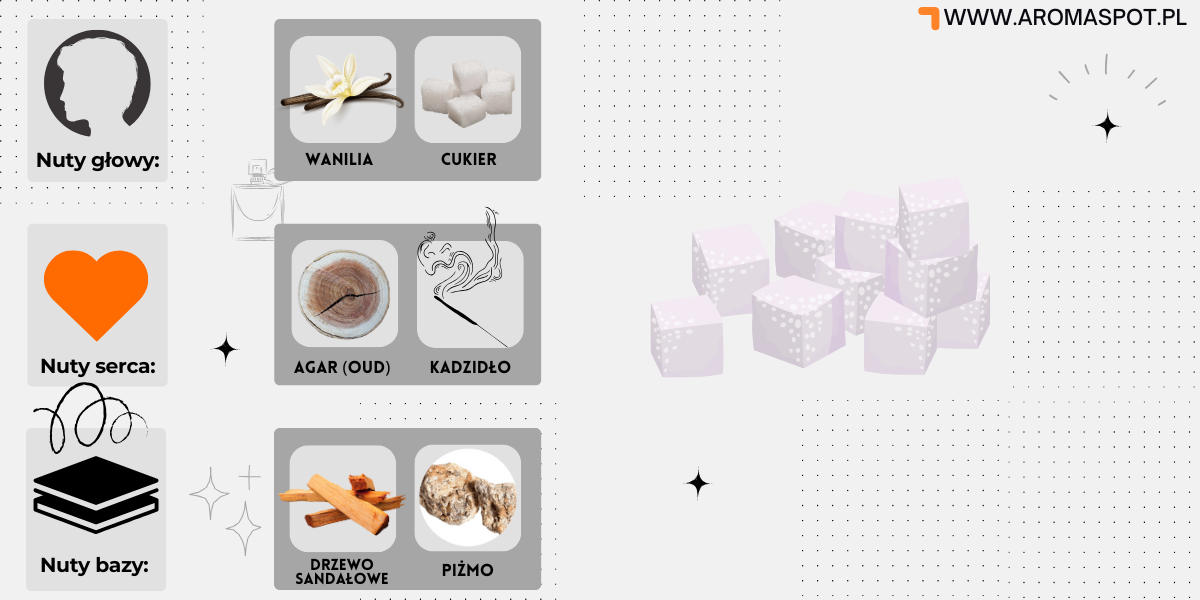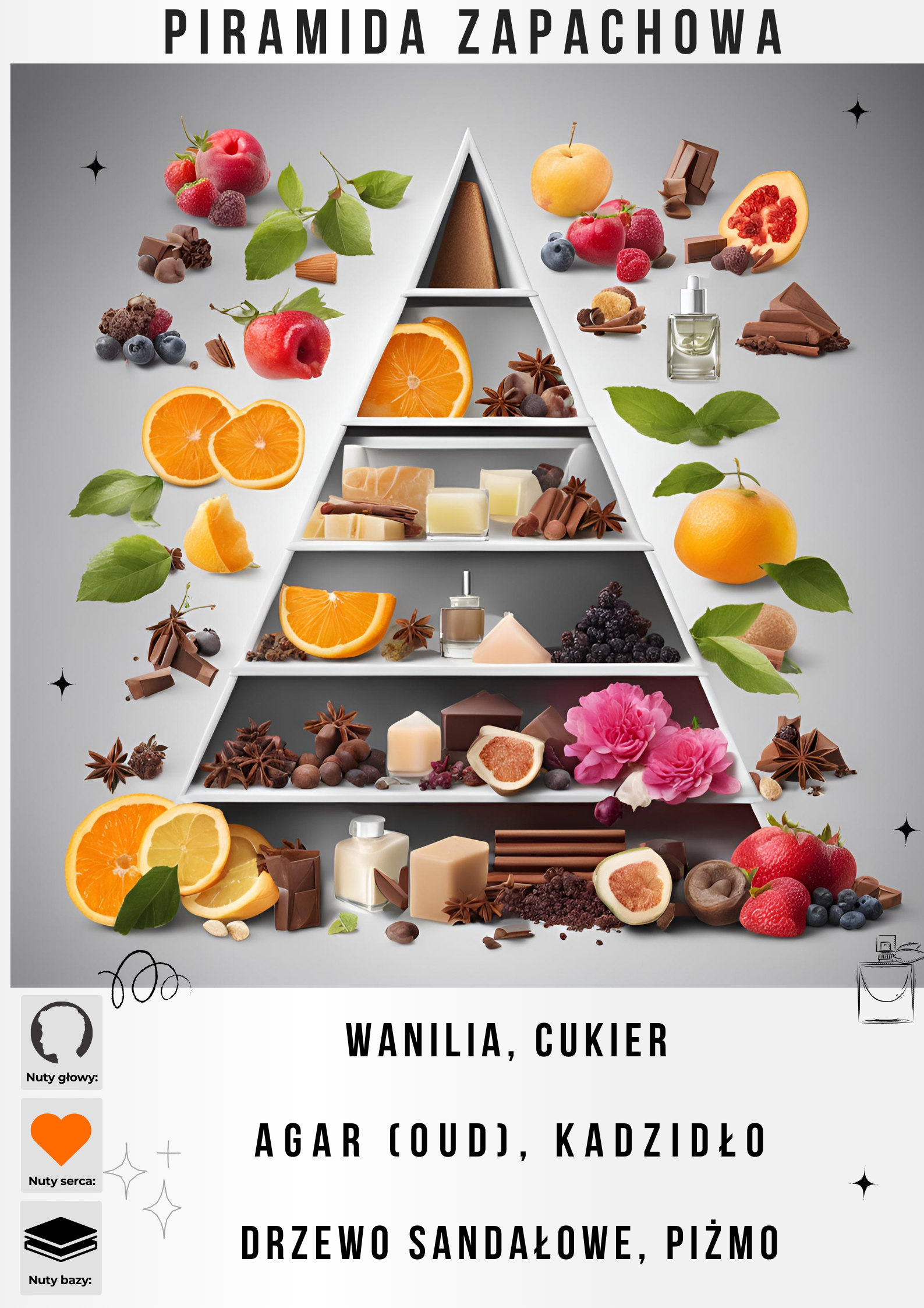 Na początku zapach oferuje przyjemną, otulającą słodycz wanilii i cukru, co sprawia, że jest wyjątkowo ciepły i przyjemny. W sercu pojawia się oud (agar) oraz kadzidło, które dodają perfumom intensywności i tajemniczości, wprowadzając lekko drzewną, dymną nutę. Drzewo sandałowe i piżmo w bazie natomiast nadają kompozycji głębi, zapewniając jej trwałość oraz zmysłowy, ciepły ślad na skórze.