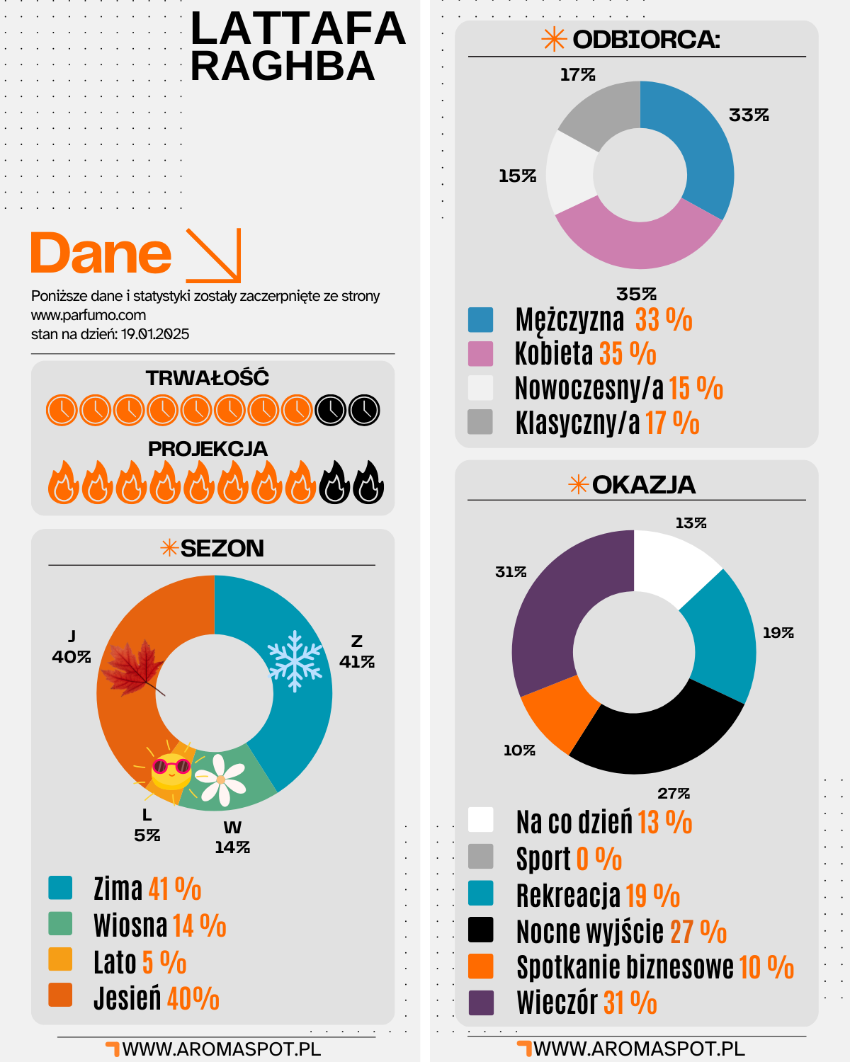 Raghba to zapach, który łączy słodycz z drzewnymi i dymnymi akcentami, tworząc wyjątkowo harmonijną, orientalną kompozycję. Są to perfumy o dużej trwałości, które sprawdzą się idealnie w chłodniejsze dni, otulając zmysły ciepłem i elegancją. To propozycja dla osób poszukujących zapachu pełnego charakteru, ale zarazem komfortowego i zmysłowego.