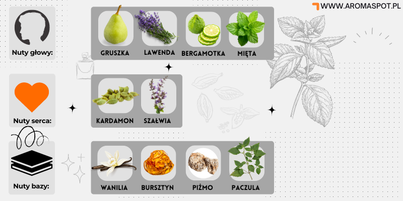 Nutami głowy są: Gruszka, Lawenda, Bergamotka i Mięta; nutami serca są: Kardamon i Szałwia; nutami bazy są: Wanilia, Bursztyn, Piżmo i Paczula.