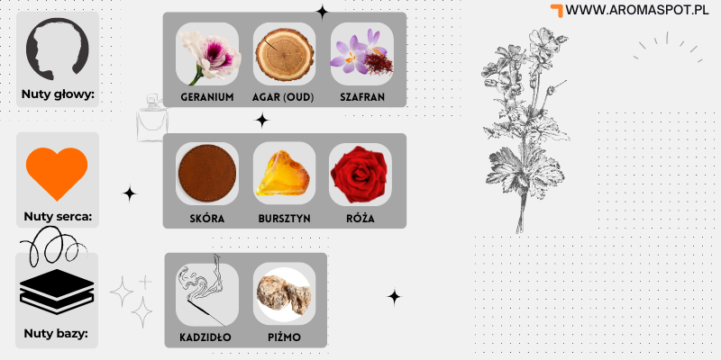 Nutami głowy są: Geranium, Agar (oud) i Szafran; nutami serca są: Skóra, Bursztyn i Róża; nutami bazy są: Kadzidło i Piżmo.