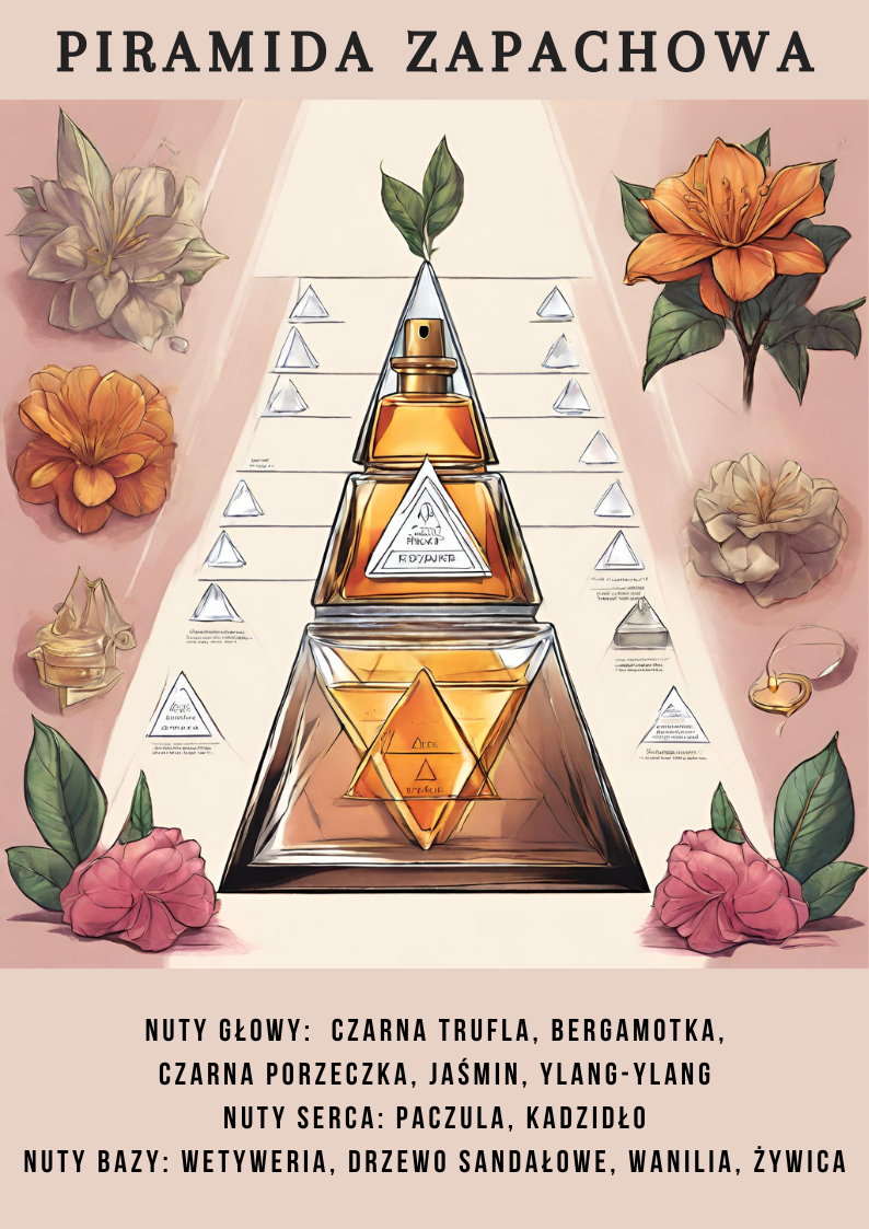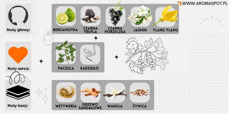 Nutami głowy są: Bergamotka, Czarna trufla, czarna porzeczka, Jaśmin Ylang-ylang; nutami serca są: Paczula i Kadzidło; nutami bazy są: Wetyweria, Drzewo sandałowe, Wanilia i Żywica.