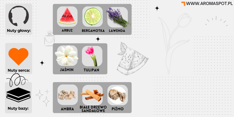 Nutami głowy są: Arbuz, Bergamotka i Lawenda; nutami serca są: Lotos i Jaśmin; nutami bazy są: Piżmo, Drzewo sandałowe i Ambra.