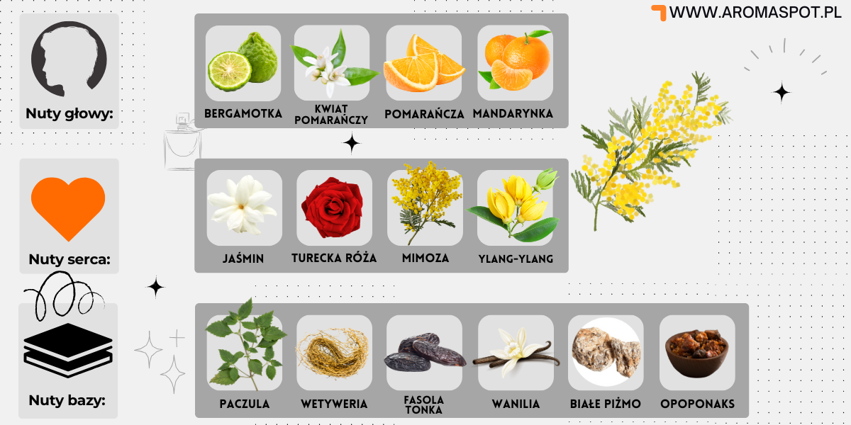 Nutami głowy są: Bergamotka, Kwiat pomarańczy, Pomarańcza i Mandarynka; nutami serca są: Jaśmin, Róża turecka, Mimoza i Ylang-ylang; nutami bazy są: Paczula, Wetyweria, Fasolka tonka, Wanilia, Białe piżmo i Opoponaks.