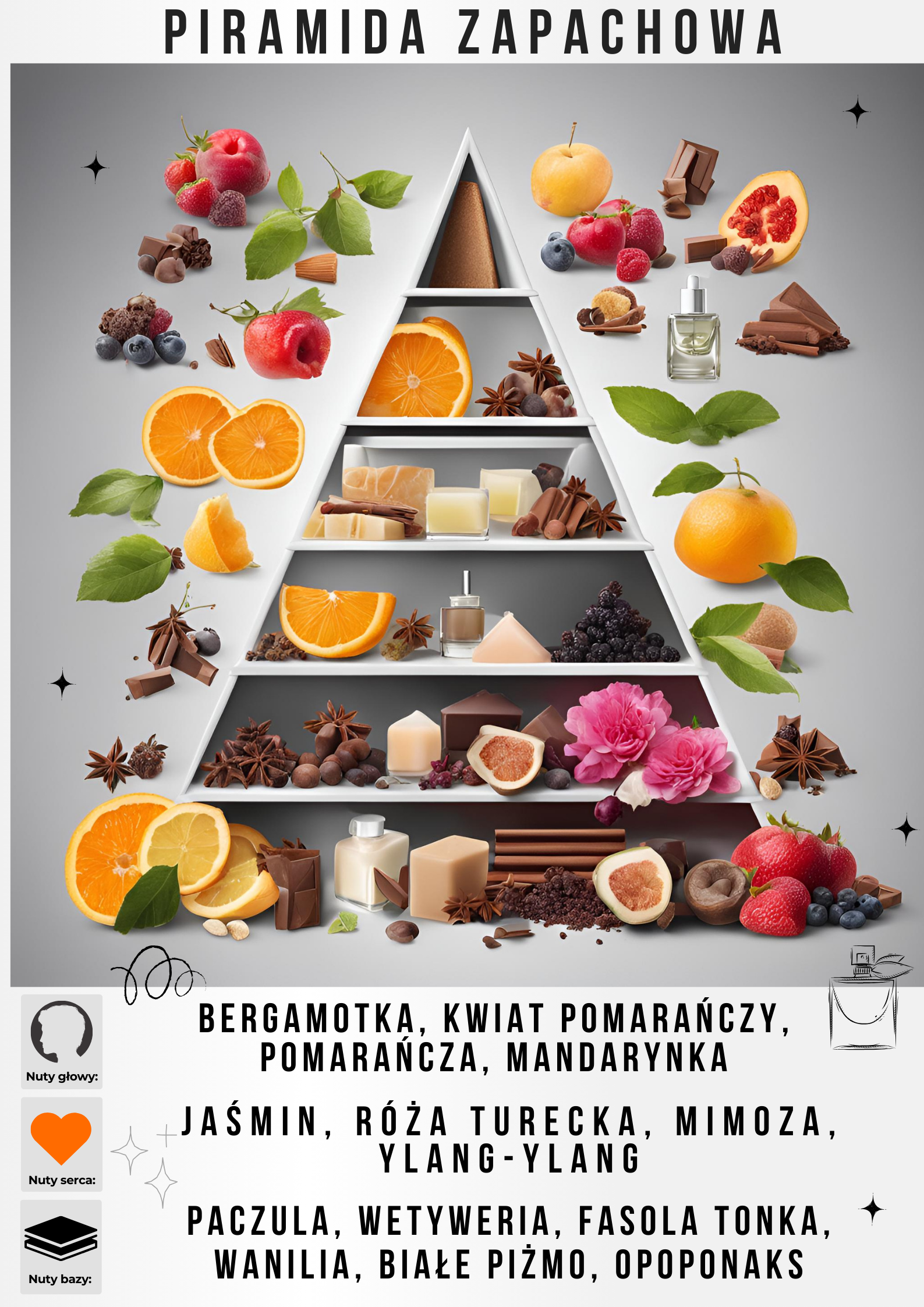 Nutami głowy są: Bergamotka, Kwiat pomarańczy, Pomarańcza i Mandarynka; nutami serca są: Jaśmin, Róża turecka, Mimoza i Ylang-ylang; nutami bazy są: Paczula, Wetyweria, Fasolka tonka, Wanilia, Białe piżmo i Opoponaks.