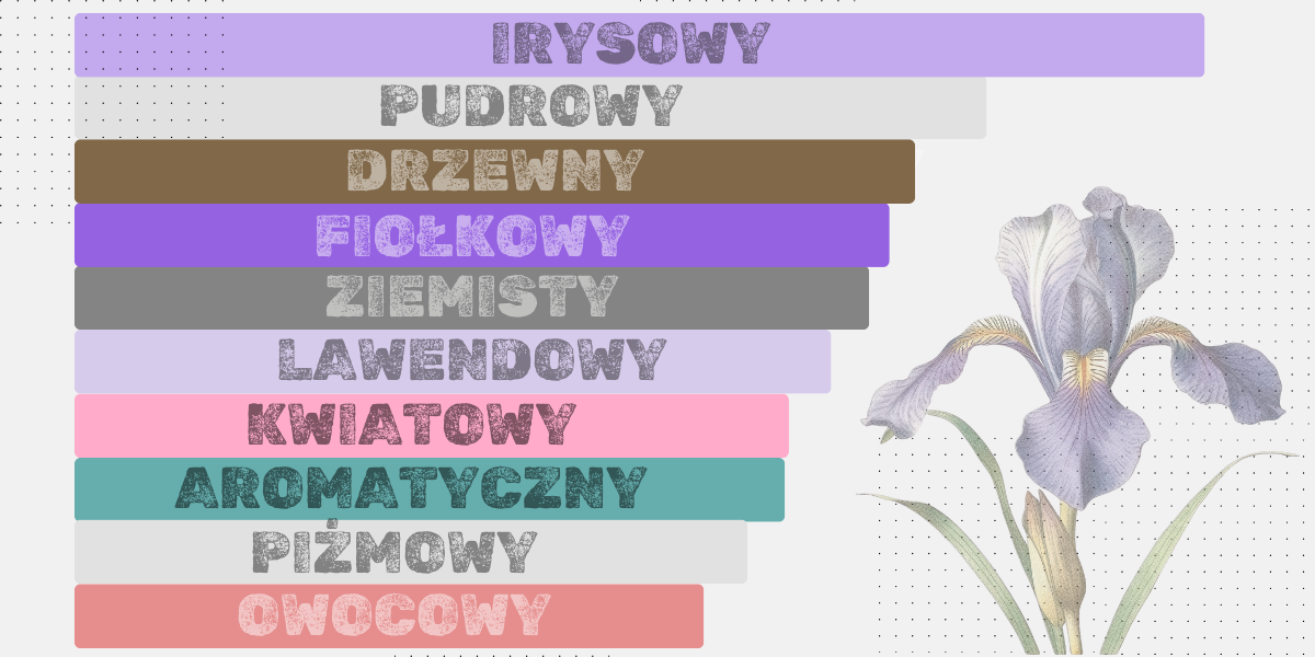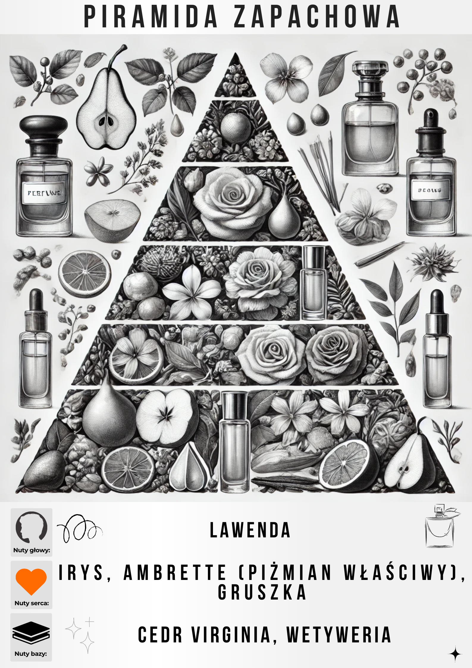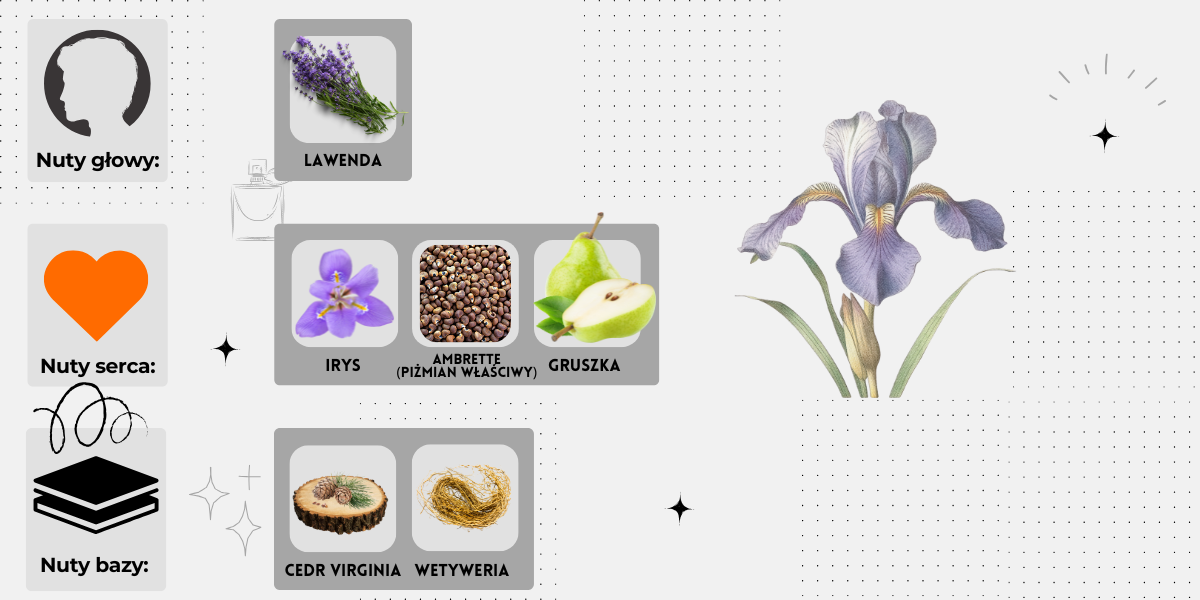 Główne akordy: irysowy pudrowy drzewny fiołkowy ziemisty lawendowy kwiatowy aromatyczny piżmowy owocowy