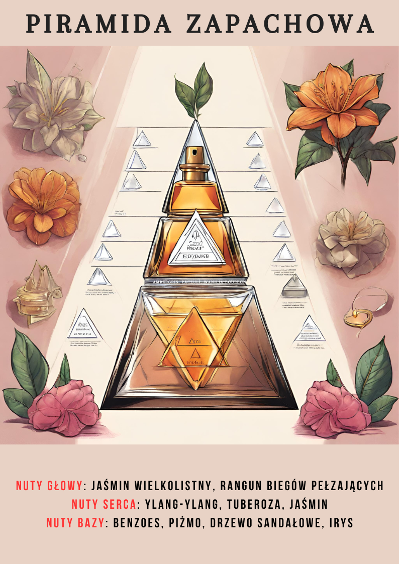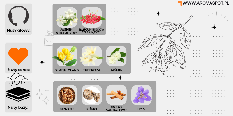 Główne akordy: białe kwiaty pudrowy piżmowy żółtych kwiatów tuberozowy ambrowy kwiatowy ciepły korzenny słodki
