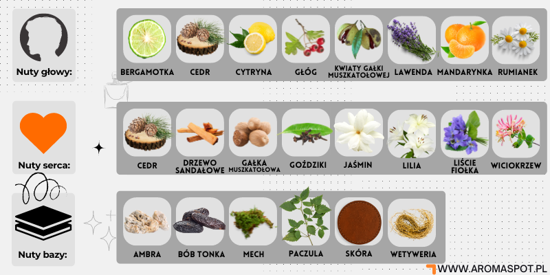 Nutami głowy są: Kwiat muszkatołowca, Lawenda, Cedr, Rumianek, Tangeryna, Głóg, Bergamotka i Cytryna; nutami serca są: Liście fiołka, Gałka muszkatołowa, Cedr, Drzewo sandałowe, Goździk (przyprawa), Wiciokrzew, Jaśmin i Konwalia; nutami bazy są: Skóra, Wetyweria, Piżmo, Bursztyn, Paczula i Fasolka tonka.