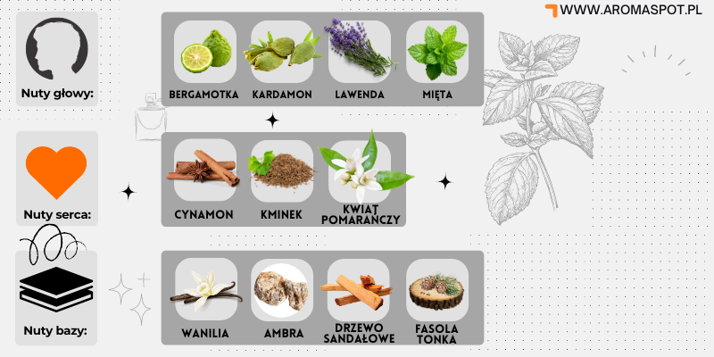 Nutami głowy są: Lawenda, Mięta, Kardamon i Bergamotka; nutami serca są: Cynamon, Kwiat pomarańczy i Kminek; nutami bazy są: Wanilia, Fasolka tonka, Bursztyn i Drzewo sandałowe.
