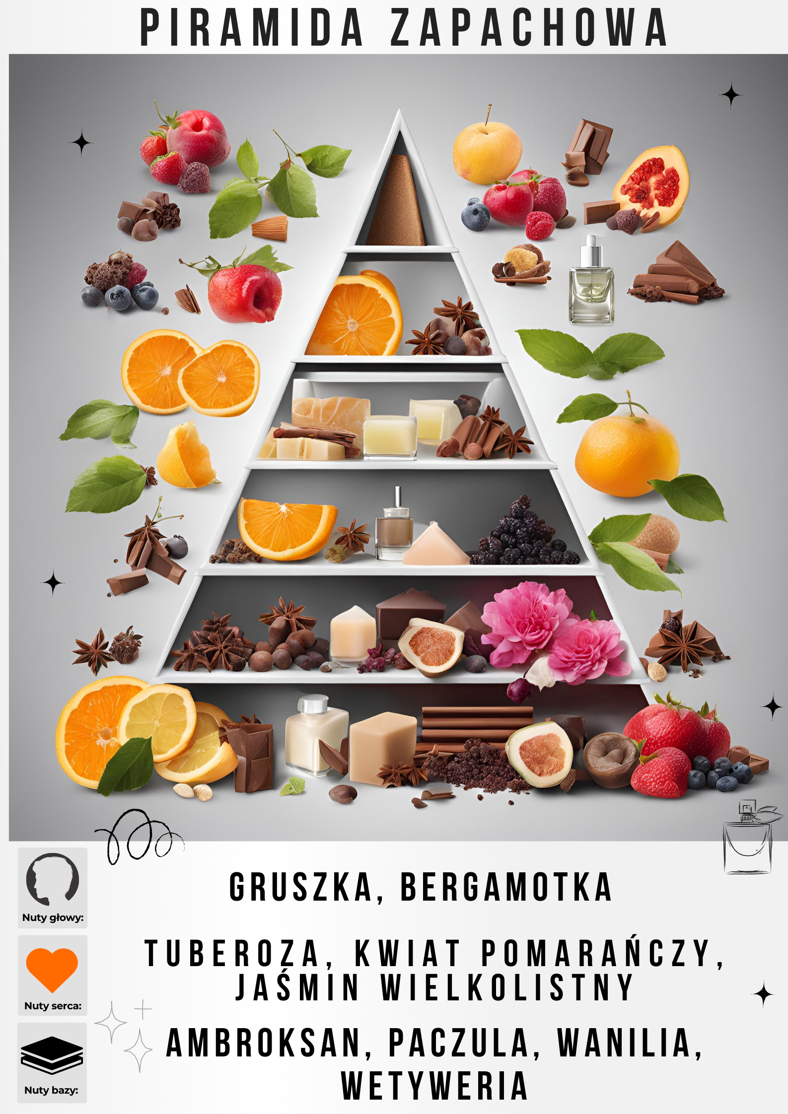 Główne akordy: białe kwiaty ambrowy tuberozowy cytrusowy piżmowy drzewny paczulowy słodki zwierzęcy ziemisty