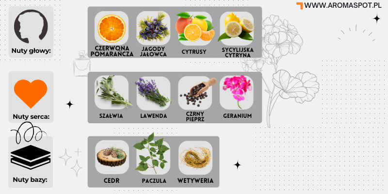 Nutami głowy są: Czerwona pomarańcza, Jagody jałowca, Cytrusy i Sycylijska cytryna; nutami serca są: Szałwia, Lawenda, Czarny pieprz i Geranium; nutami bazy są: Cedr, Paczula i Wetyweria.