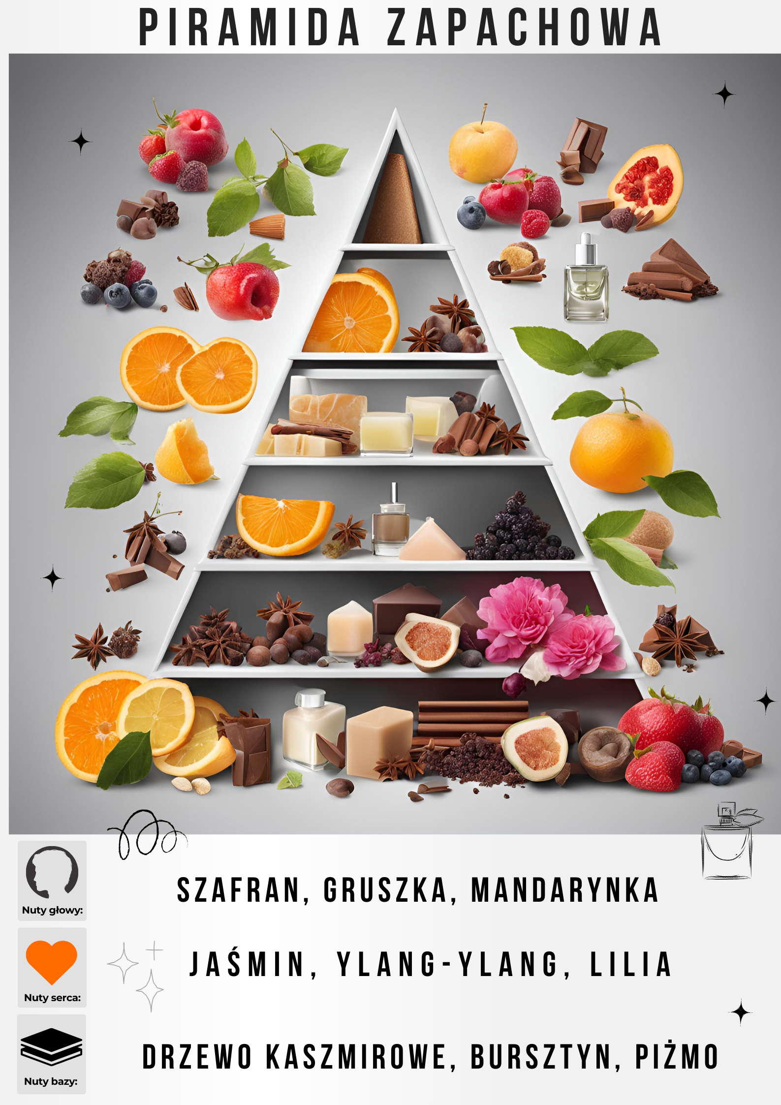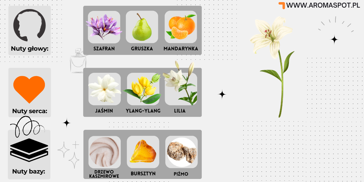 Otwarcie zapachu to połączenie intensywnego szafranu, soczystej gruszki i rześkiej mandarynki, które wprowadzają do kompozycji powiew świeżości i lekkości. Z czasem zapach przechodzi w bardziej kwiatową, ale wciąż głęboko ciepłą fazę, gdzie jaśmin, ylang-ylang i lilia tworzą subtelną, ale wyrazistą sercową nutę, która nadaje zapachowi wyjątkowej kobiecości i elegancji.