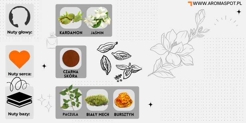 Główne akordy: pudrowy drzewny ambrowy piżmowy cytrusowy białe kwiaty fiołkowy słodki świeży korzenny dymny