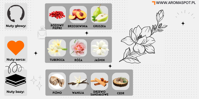 Główne akordy: piżmowy pudrowy lekko korzenny tuberozowy drzewny