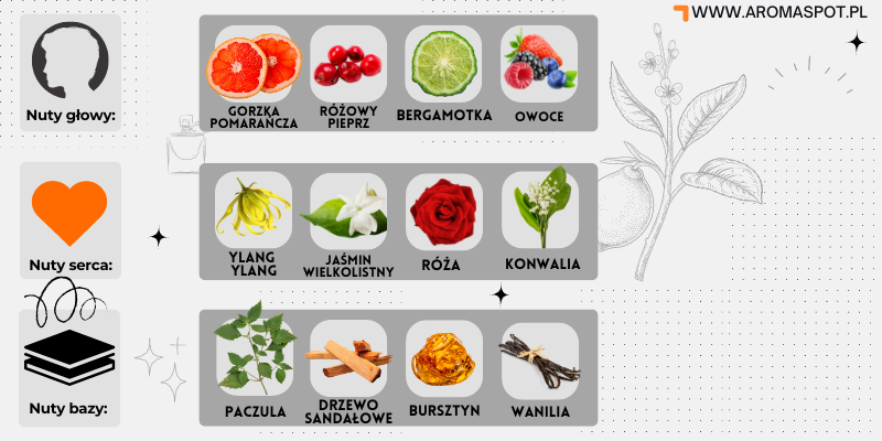 Nutami głowy są Gorzka pomarańcza, Różowy pieprz, Bergamotka i Owoce; nutami serca są Ylang-ylang, Jaśmin wielkolistny, Róża i Konwalia; nutami bazy są Paczula, Drzewo sandałowe, Bursztyn i Wanilia.