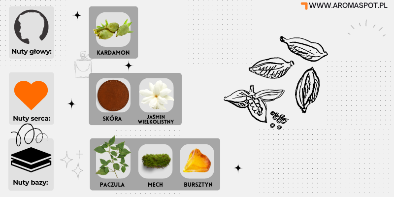 Nutę głowy stanowi: Kardamon; nutami serca są: Skóra i Jaśmin wielkolistny; nutami bazy są: Paczula, Mech i Bursztyn.