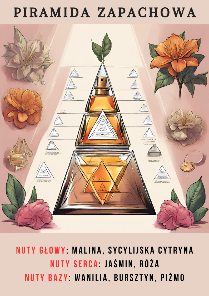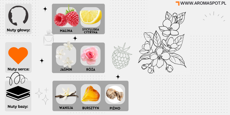 Nutami głowy są: Malina i Sycylijska cytryna; nutami serca są: Jaśmin i Róża; nutami bazy są: Wanilia, Bursztyn i Piżmo.