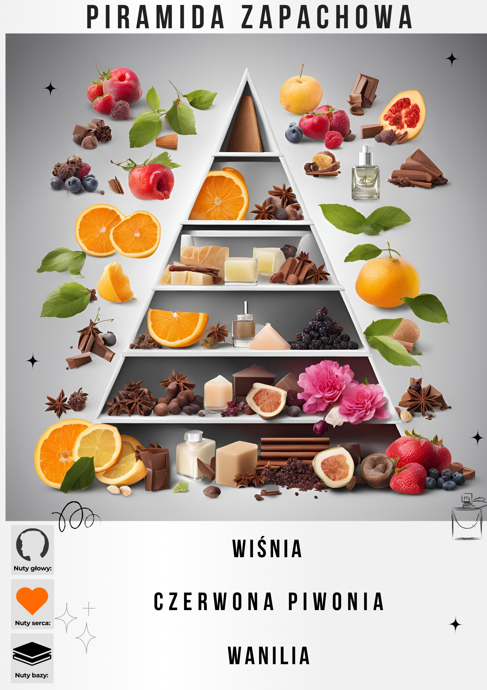 Na początku perfumy otwierają się świeżą, soczystą nutą wiśni, która nadaje im wyrazistości i owocowej energii. W sercu kompozycji króluje czerwona piwonia – kwiat o delikatnym, ale pełnym charakterze, który wprowadza do zapachu romantyzm i lekkość. Baza z wanilią natomiast otula całość ciepłem i słodyczą, tworząc zmysłowy, trwały finisz.