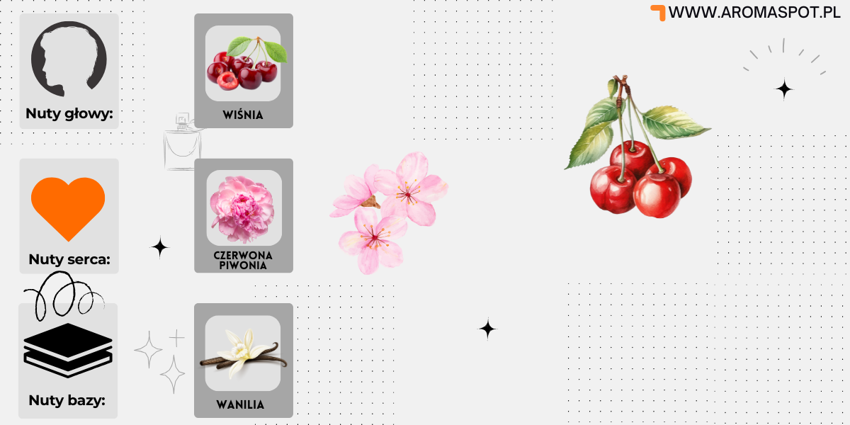 Nutę głowy stanowi Wiśnia; nutą serca jest Czerwona piwonia; nutą bazy jest Wanilia.