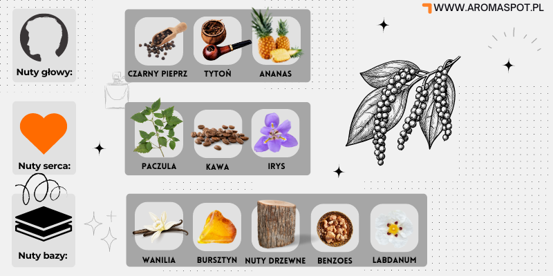 Nutami głowy są: Czarny pieprz, Tytoń i Ananas; nutami serca są: Paczula, Kawa i Irys; nutami bazy są: Wanilia, Bursztyn, Nuty drzewne, Benzoes i Labdanum.