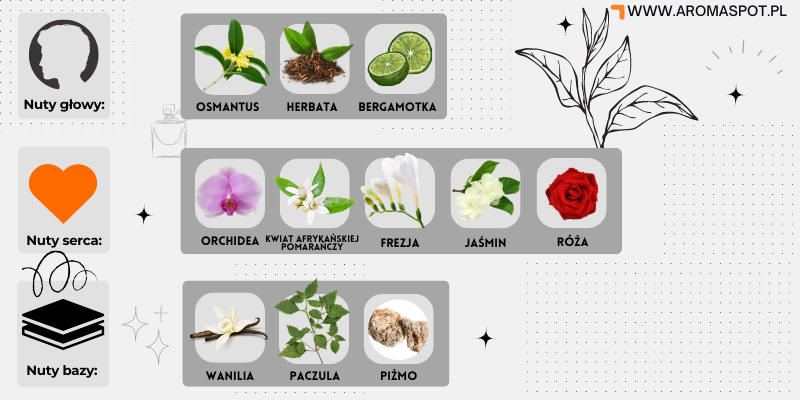 Nutami głowy są: Osmantus, Herbata i Bergamotka; nutami serca są: Orchidea, Kwiat afrykańskiej pomarańczy, Frezja, Jaśmin i Róża; nutami bazy są: Wanilia, Paczula i Piżmo.