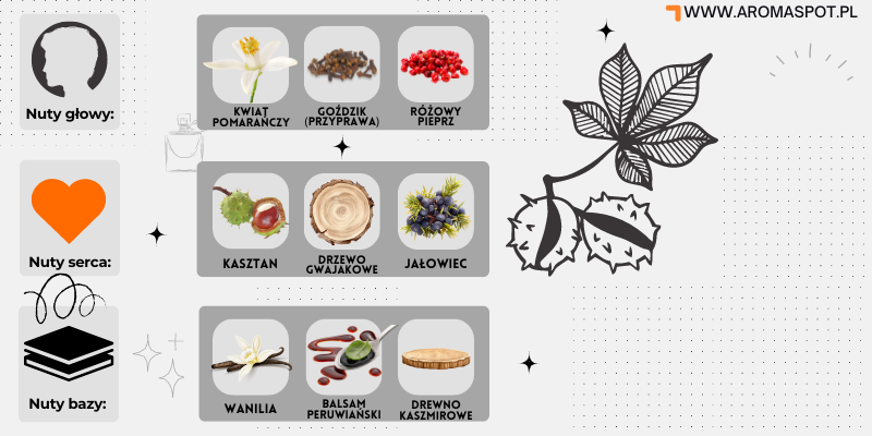 Nutami głowy są: Kwiat pomarańczy, Goździk (przyprawa) i Różowy pieprz; nutami serca są: Kasztan, Drzewo gwajakowe i Jałowiec; nutami bazy są: Wanilia, Balsam peruwiański i Drewno kaszmirowe.