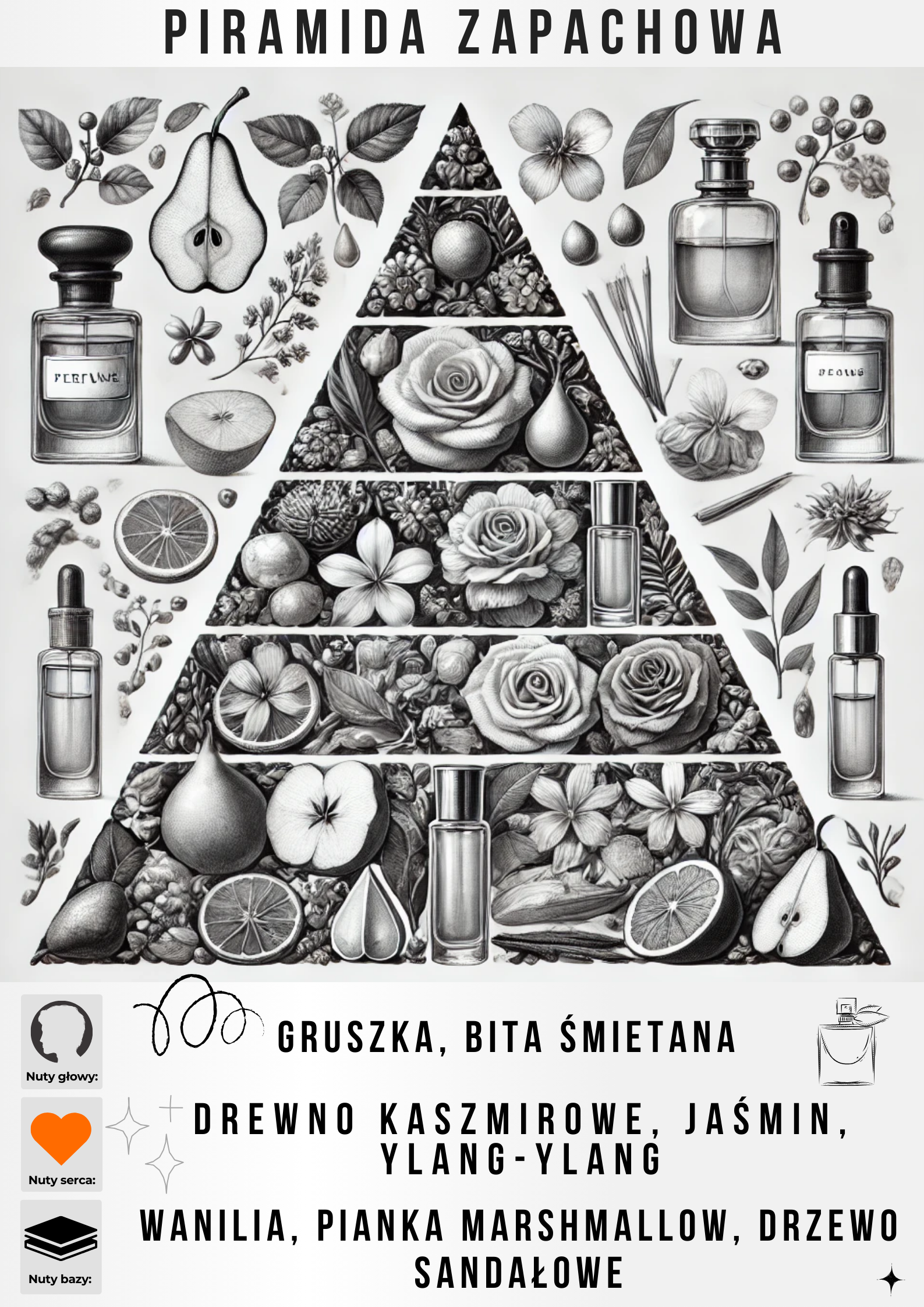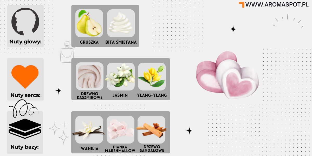 Nutami głowy są: Gruszka i Bita śmietana; nutami serca: są Drewno kaszmirowe, Jaśmin i Ylang-ylang; nutami bazy: są Wanilia, Pianka marshmallow i Drzewo sandałowe.
