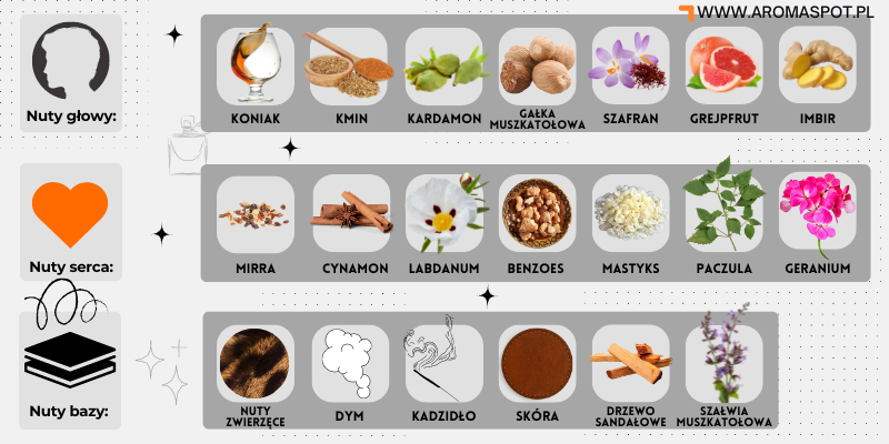 Nutami głowy są: Koniak, Kmin, Kardamon, Gałka muszkatołowa, Szafran, Grejpfrut i Imbir; nutami serca są: Mirra, Cynamon, Labdanum, Benzoes, Mastyks, Paczula i Geranium; nutami bazy są: Nuty zwierzęce, Dym, Kadzidło, Skóra, drzewo sandałowe i Szałwia muszkatołowa.