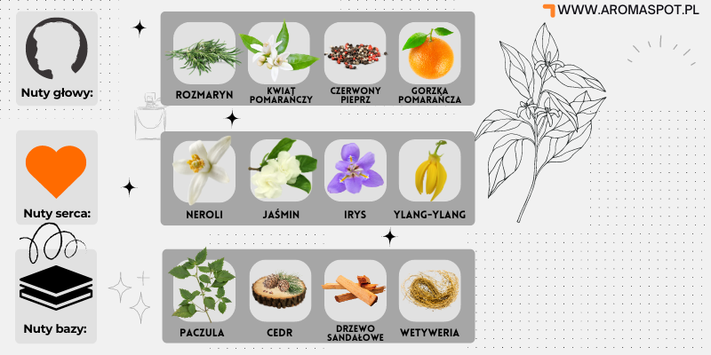Nutami głowy są: Rozmaryn, Kwiat pomarańczy, Czerwony pieprz i Gorzka pomarańcza; nutami serca są: Neroli, Jaśmin, Irys i Ylang-ylang; nutami bazy są: Paczula, Cedr, Drzewo sandałowe i Wetyweria.