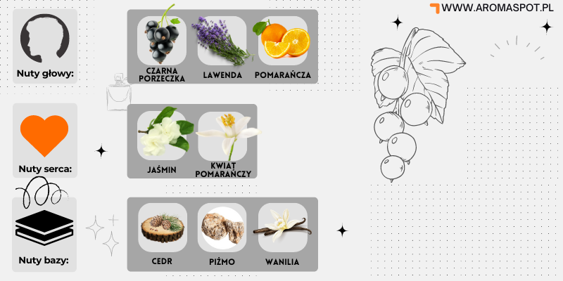 Nutami głowy są: Czarna porzeczka, Lawenda, Pomarańcza; nutami serca są: Jaśmin, Kwiat pomarańczy; nutami bazy są: Cedr, Piżmo, Wanilia.